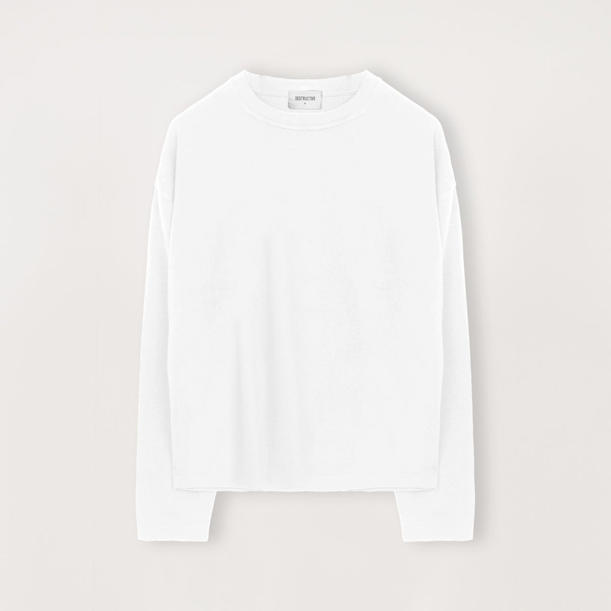 Boxy through the body with dropped shoulders and a relaxed neckline. Designed to layer cleanly beneath outerwear without feeling oversized.