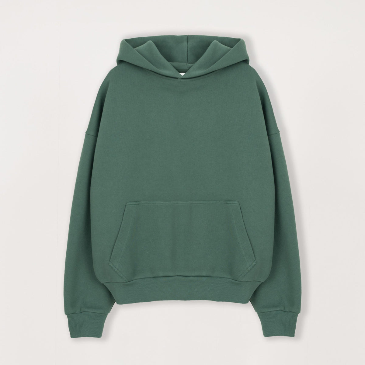 Dropped shoulders and a boxy body create a clean, structured drape with intentional volume. Finished with a tightened waistband and kangaroo pocket, the hoodie sits easy on the frame while still holding its shape.