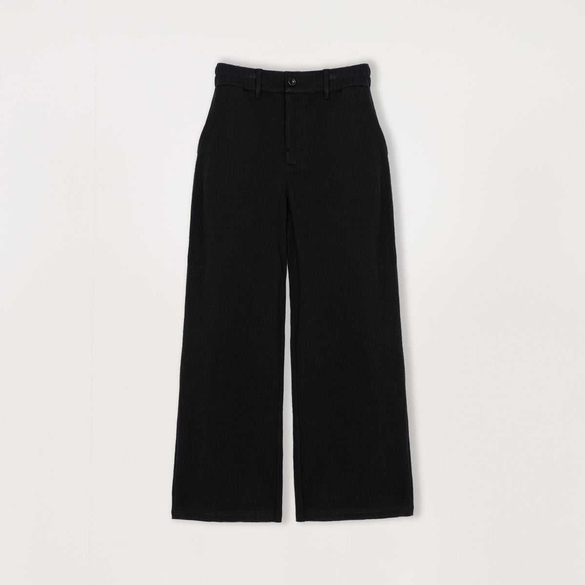 Sits clean at the waist and falls into a straight, wide leg that drapes over footwear. Relaxed through the thigh without tapering, for an easy silhouette that still feels intentional.